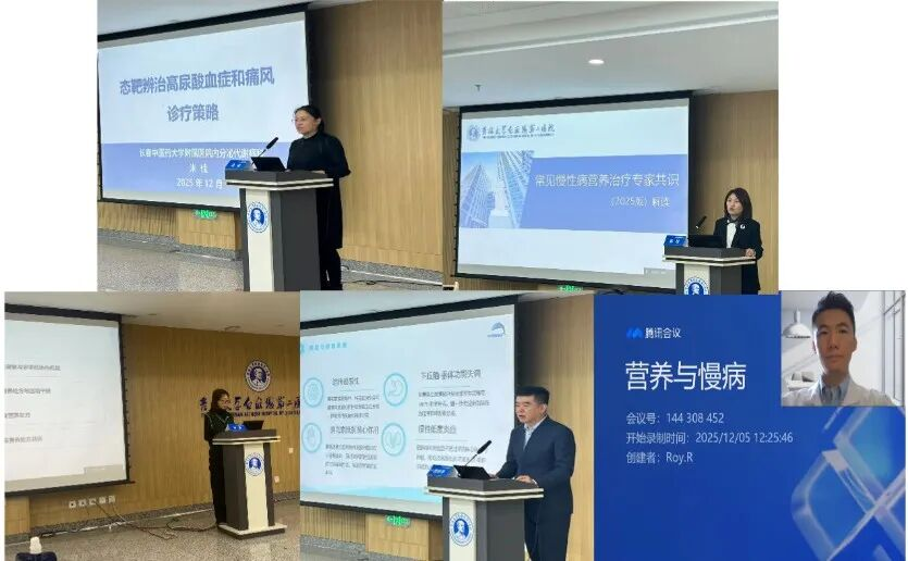学术会议中,来自于国内外知名专家围绕会议主题分享了最新研究进展和指南实践。长春中医药大学附属医院米佳教授分享《态靶辨治高尿酸血症和痛风诊疗策略》,在中医角度分享了高尿酸血症和痛风的态靶诊疗策略。吉林省人民医院马彦教授分享了《肌少症膳食营养处方及运动干预中国专家共识(2025)》,为不同疾病合并肌少症的患者提供了科学的膳食营养处方与运动干预方案。吉林大学第二医院内分泌科陈琰教授在《常见慢性病营养治疗专家共识(2025)》的报告中为常见慢性病糖尿病、高血压、高脂血症等患者提供了营养方案,体现了科学饮食在疾病综合管理中的重要性。上海嘉家健康管理公司吕志丹老师聚焦《多囊卵巢综合征的饮食营养疗愈》,在饮食营养疗愈角度为多囊卵巢综合症的治疗提供了新思路,从营养干预的机制、方案、原则启迪临床治疗。德国弗莱堡大学附属医院罗伊博士在线上分享了《营养与慢性病康复》,用最新研究数据证实营养治疗改善临床结局,强调营养管理在慢性疾病中的治疗作用,为营养治疗在慢性疾病康复中的作用提供了理论依据,打开了慢性疾病治疗的新视野。